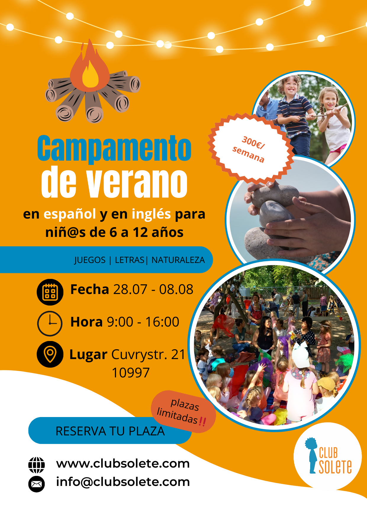 Llega el verano y llega nuestro campamento de verano bilingüe que tendrá lugar en Berlín. Pensado para niños entre los 6 y 12 años que tengan ganas de descubrir, crear y expresarse en español e inglés. Habrá actividades de inmersión lingüística, talleres creativos, salidas al aire libre, encuentros interculturales y ¡mucho más!